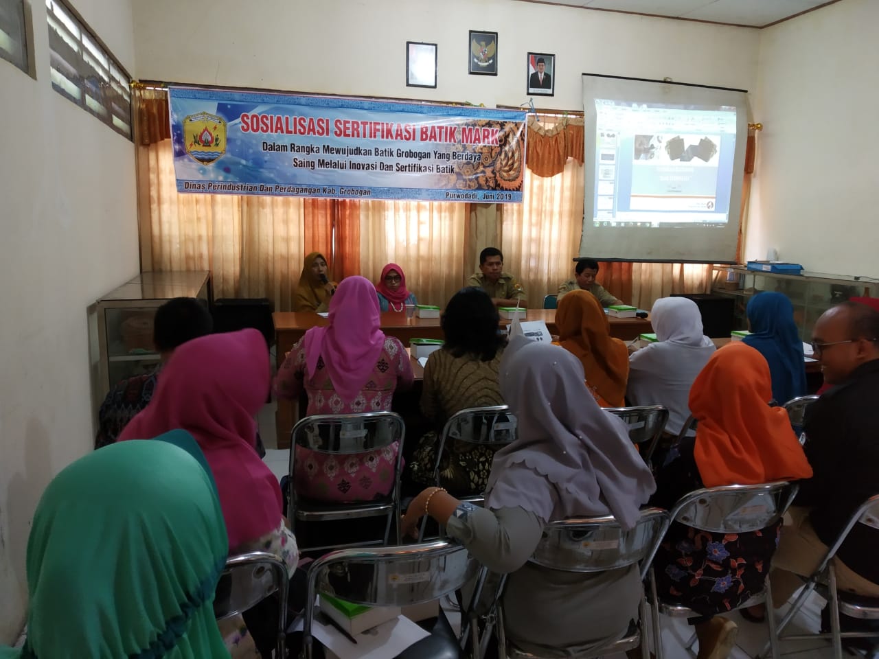 Dalam rangka MEWUJUDKAN BATIK GROBOGAN BERDAYA SAING MELALUI INOVASI DAN SERTIFIKASI BATIK. Dinas Perindustrian dan Perdagangan Kabuapten Grobogan melaksanakan Sosialisasi Sertifikasi Batik Mark